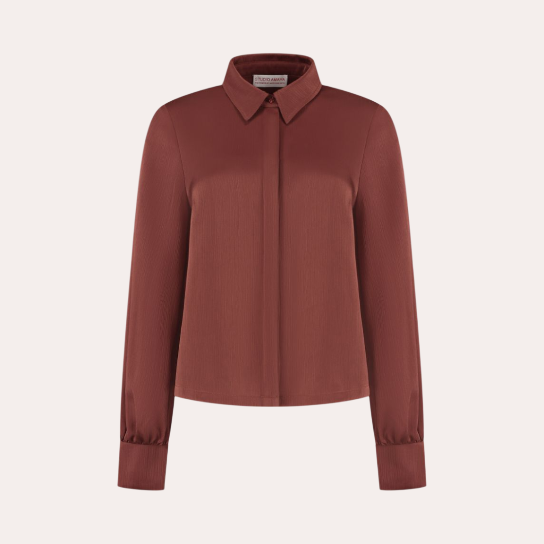 De Montana blouse van Studio Amaya is een klassieke oversized fit blouse in een glanzend ribstof met gepofte lange mouwen. Prachtig in roest kleur.