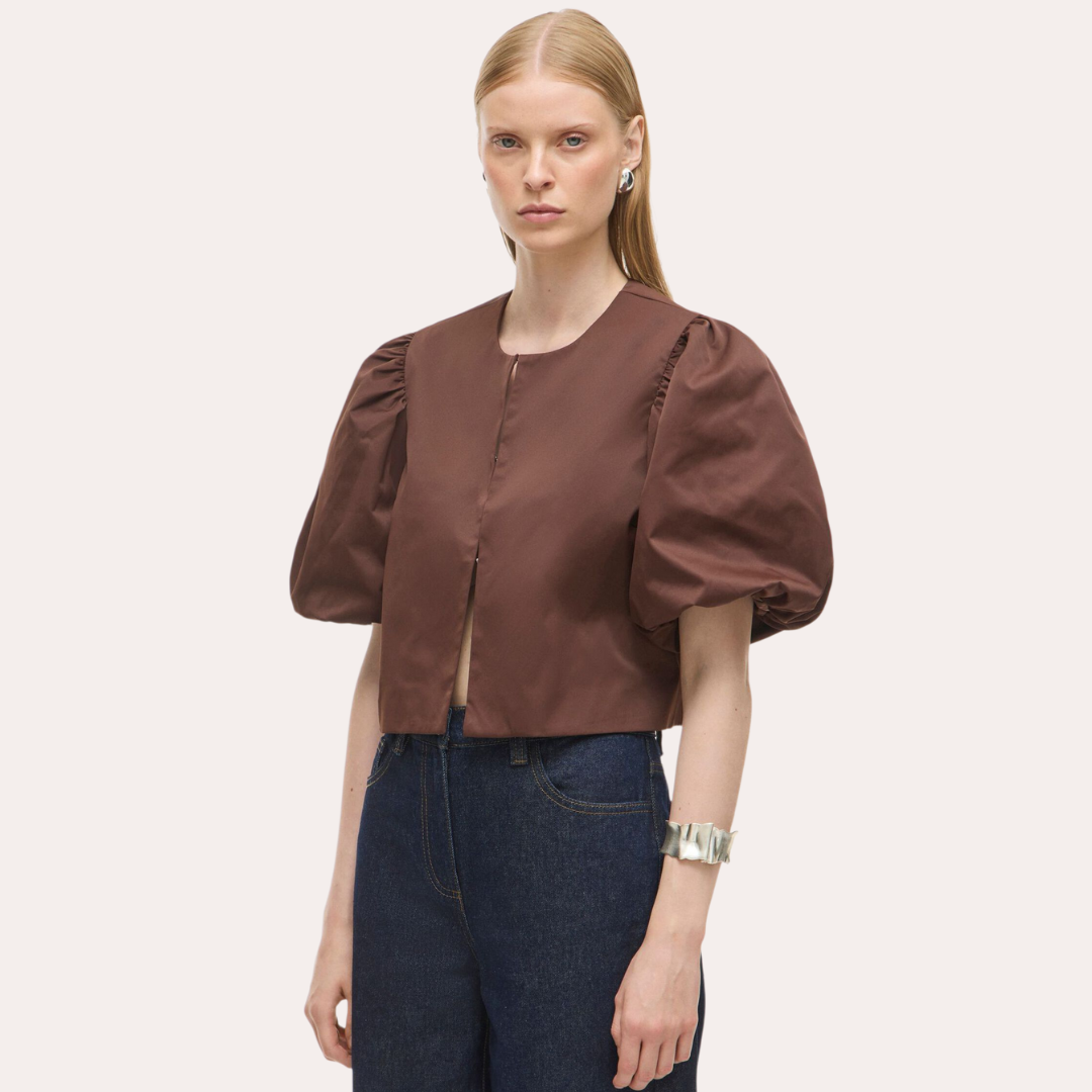 De ROUDETTA blazer is een cropped blouse met korte pofmouwen, ronde hals en haaksluiting. Leuk als jasje, maar ook als topje te dragen. De volumineuze pofmouwen creëren een vrouwelijk accent en statement.