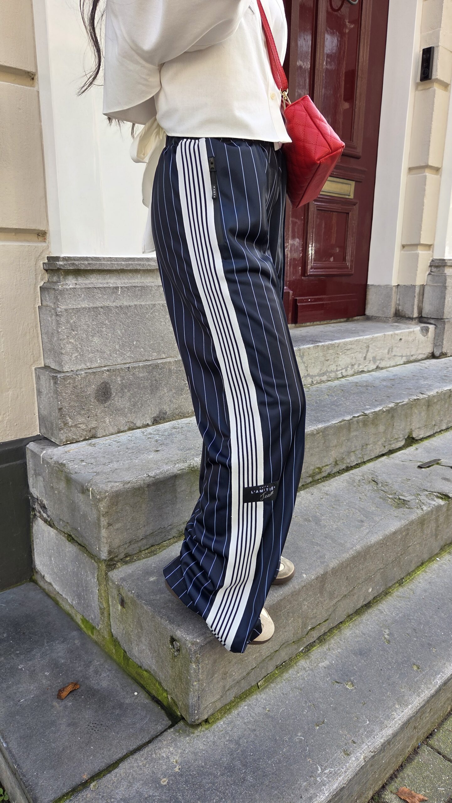 De Baggy track broek van Haute L’amitié is een joggingsbroek met wijde pijpen en krijtstrepen die een moderne verfijnde look geeft.