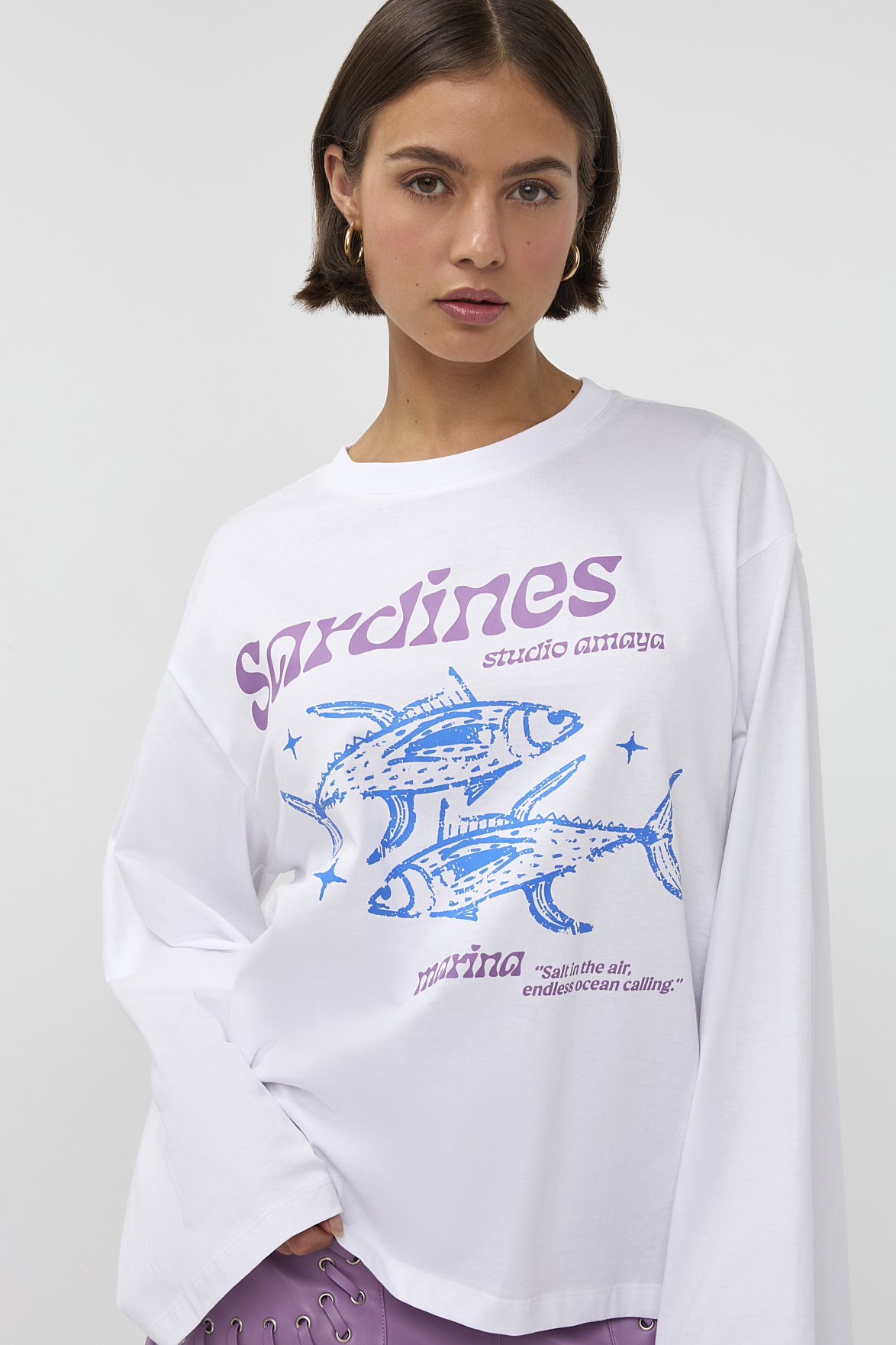 De Sardines shirt van Studio Amaya is een longsleeve top met zomerse sardientjes print. Een fijne basic die je eindeloos kan stijlen.