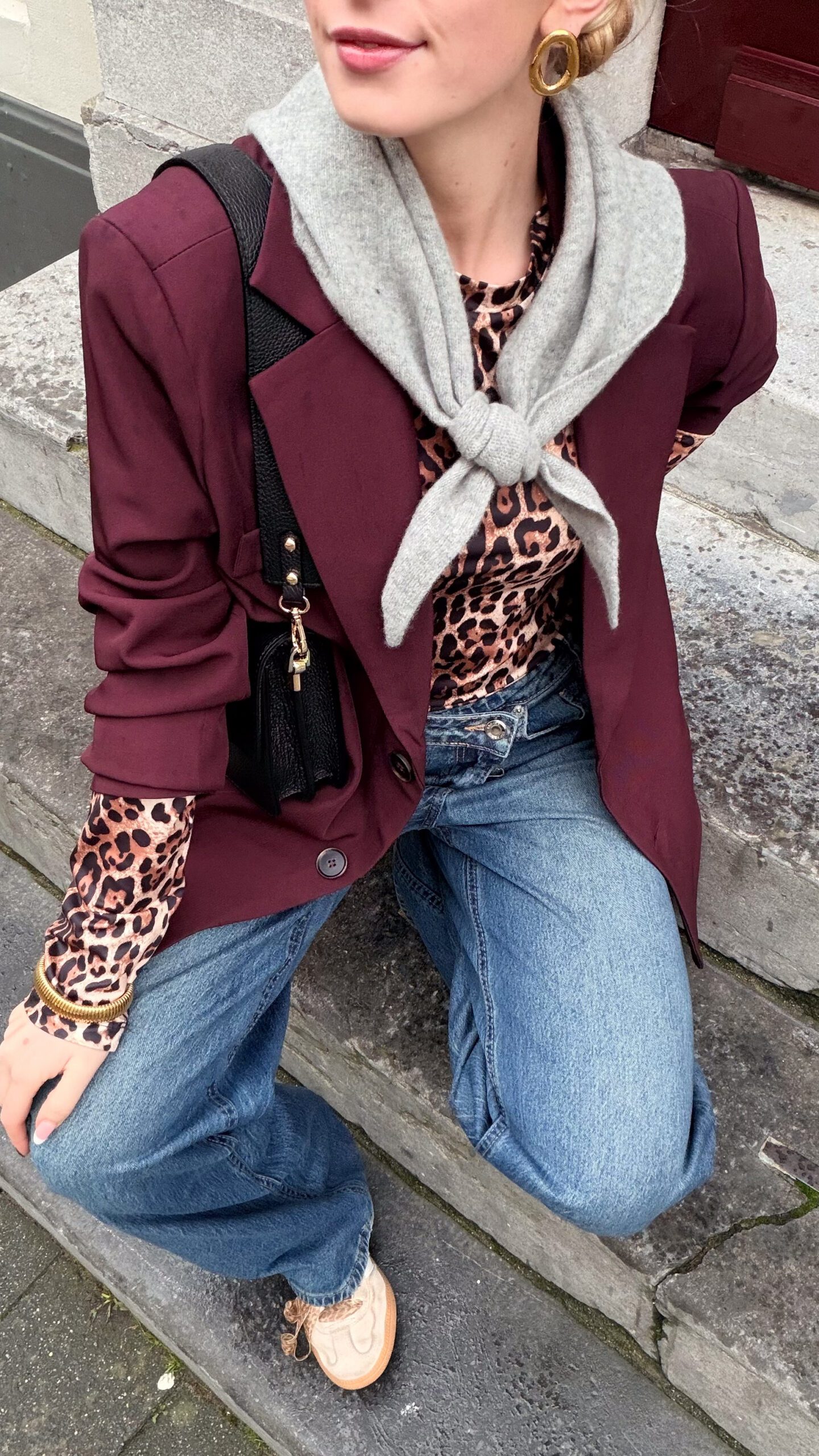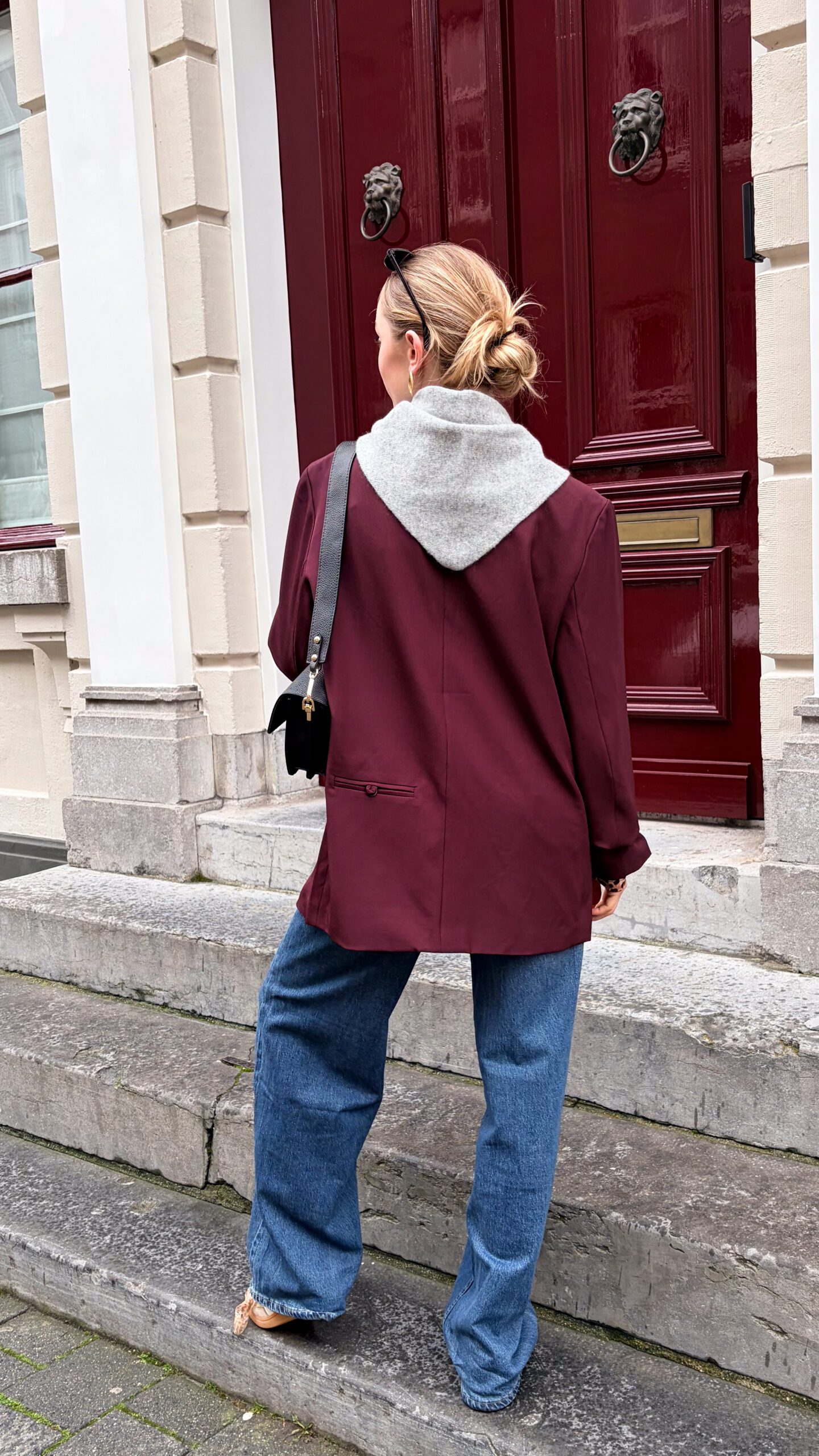Deze trendy oversized blazer in bordeaux kleur, heeft een speelse paspelzakje op de rug. Klassiek en eindeloos te stijlen.