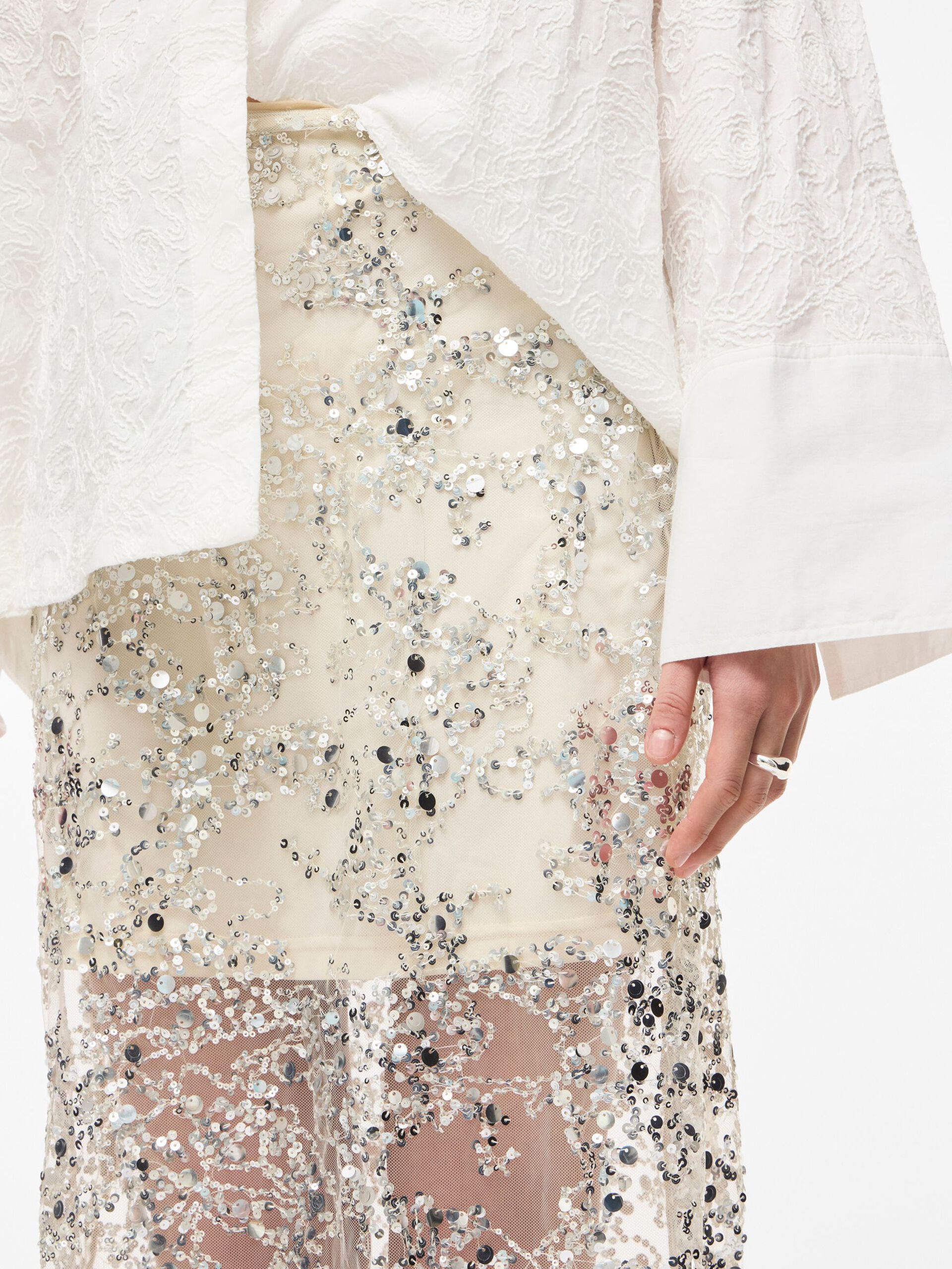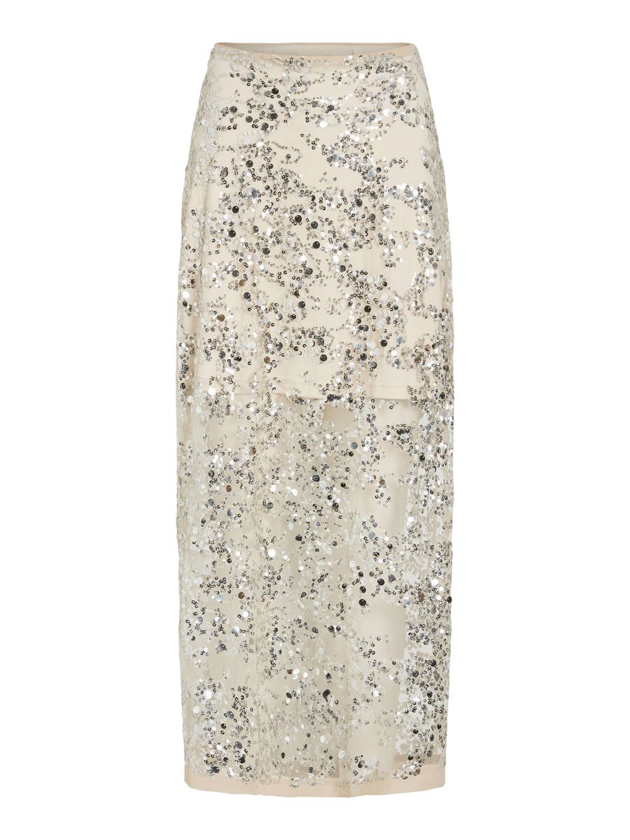De ROULEONA rok is een vrouwelijke maxi rok met een hoge taille en een split aan de achterkant. De rok heeft zilveren pailletten.