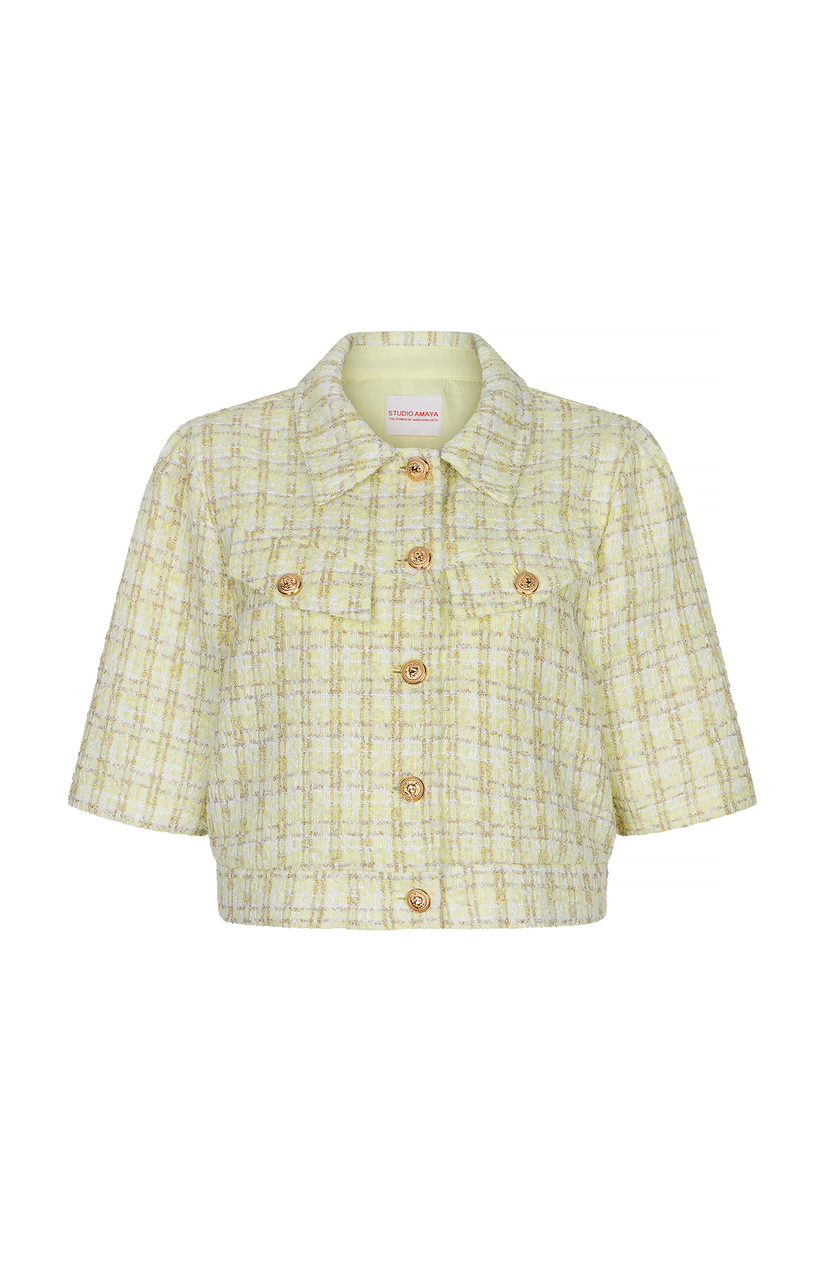 De Noor jacket is een klassieke tweed jasje met sierlijke gouden knopen en korte mouwen. Een tijdloos statement piece.